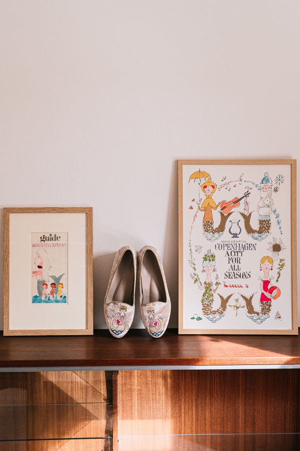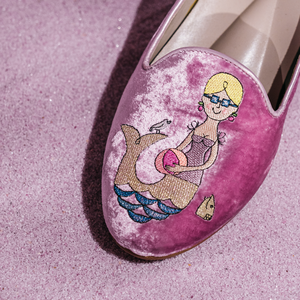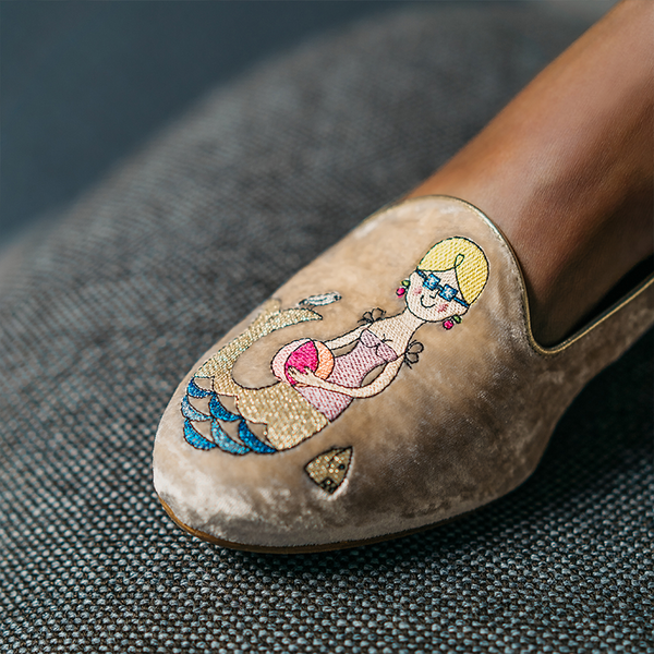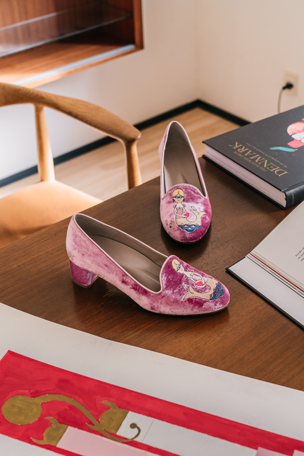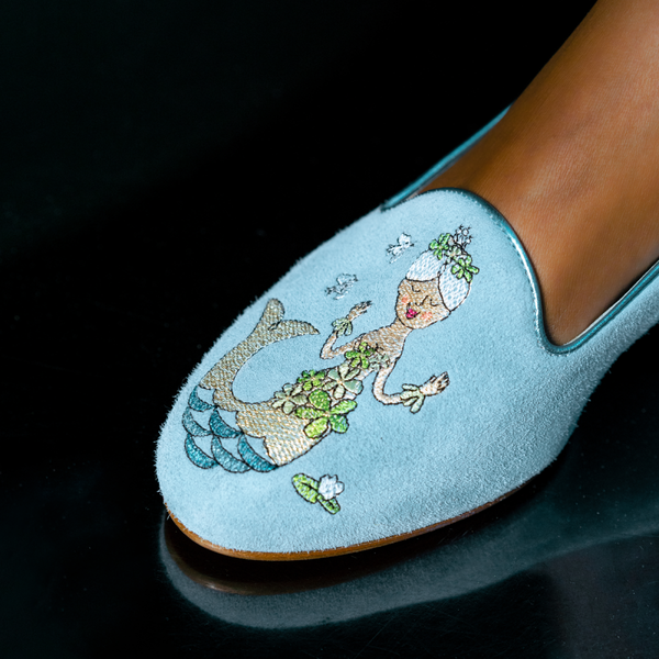 De broderede havfruer, som pryder skoens overflade, er inspireret af de sæsonbaserede havfruer af den danske kendte kunstner Ib Antoni.