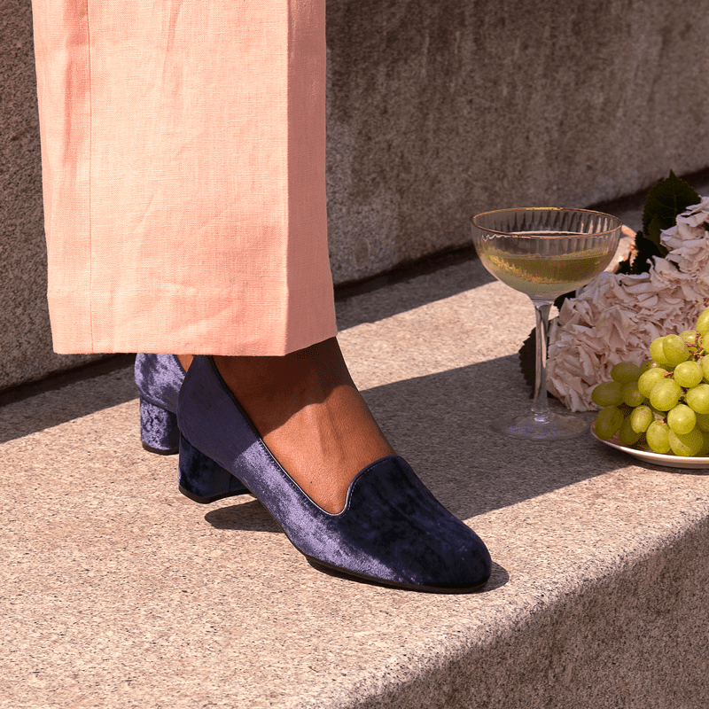 Vores allerførste mule med 4 cm blokhæl i de fineste juvel toner. Hun er fremstillet af det blødeste velour, og hendes fine håndbukkede læderkant gør, at hun sidder godt fast på foden. Den validerede lædersål giver ekstra god komfort, når du skal en tur på kontoret, på cafe eller danse til forårets fester.